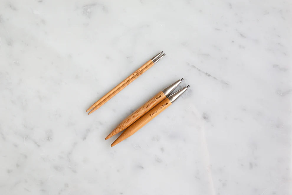 This interchangeable circular knitting needle set from Kinki Amibari comes with 4 beautifully crafted bamboo needle tips, 3 cords and a pair of stoppers! Built to last and for optimum performance, each needle glides effortlessly through yarn, creating perfect, even stitches and preventing hand fatigue. Bamboo is not only smooth to the touch and beautiful, it is also lightweight and flexible!